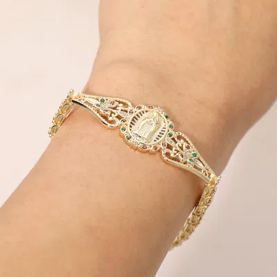 Cz Stone Embellished Filigree Detail Religious Oval Medallion Accent Chain Bracelet Gold