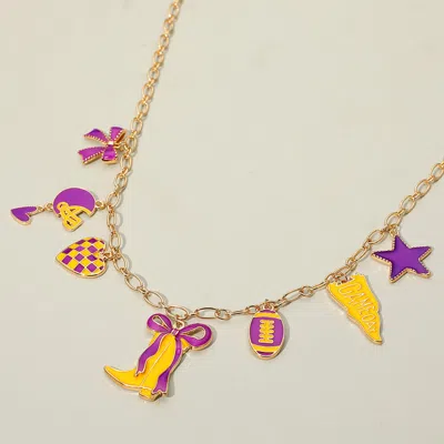 Necklace Size - 17.75" + 3" LDecor Size - 1.5" LCelebrate your team spirit with this playful game day charm necklace featuring football, cheer bow, helmet, heart, star, and boot charms. Designed with a fun mix of enamel details, this necklace makes the perfect accessory for sports fans and cheer enthusiasts.