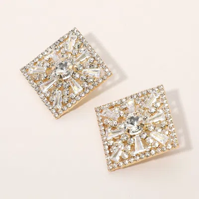 FASHNZFAB Glass Stone Embellished Diamond Frame Evening Earrings - Clear, Gold