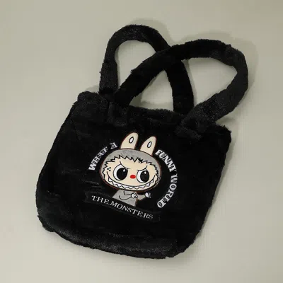 Monster Bunny Character Embroidered Faux Fur Plush Tote Bag In Black