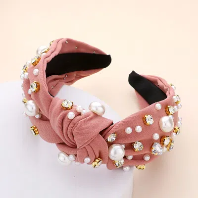 FASHNZFAB Pearl Round Stone Embellished Knot Burnout Headband In Pink