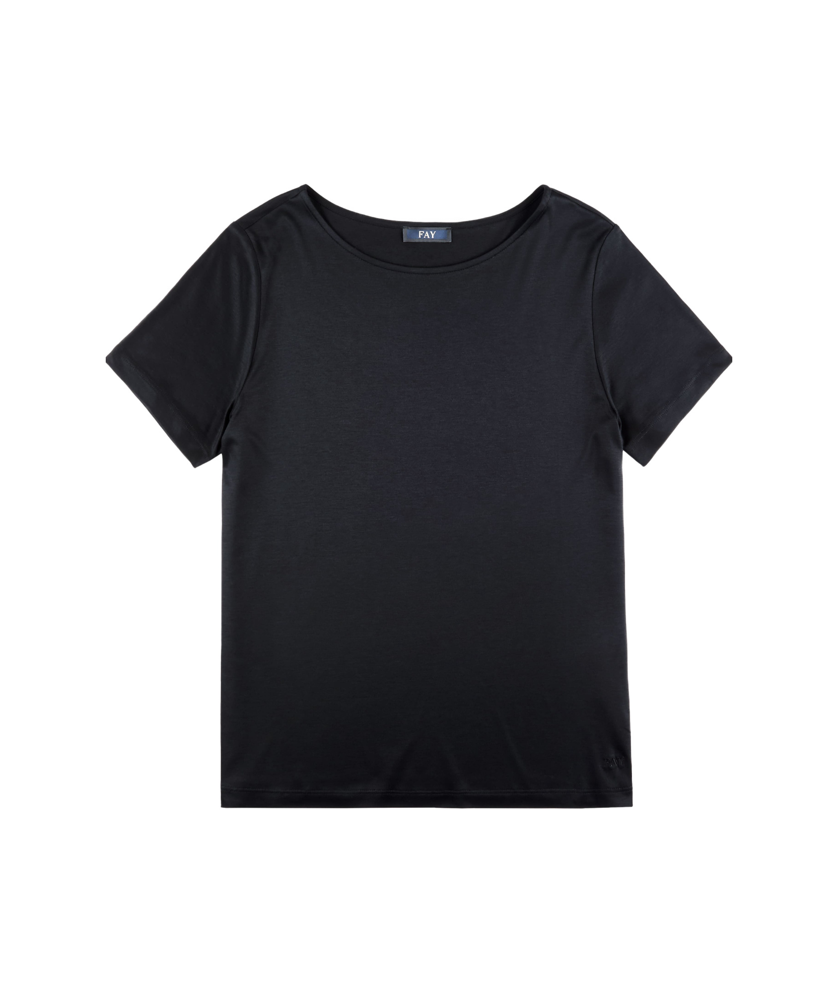 Short-sleeved T-shirt with boat neckline. Made of fluid viscose jersey with a shiny effect, it is a very versatile and at the same time feminine garment, enriched by the Fay logo embroidered on the bottom. - Bateau neckline - Short sleeves - Fay logo - Regular fit DESIGNER ID: NPWB2506150XBAB999