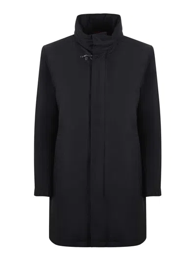 Fay nylon jacket. Anti-drop treatment. Padded with technical wadding. High collar with hood inserted inside. Iconic hook at the chin strap. Zip and button closure hidden by a placket. Diagonal pockets. Internal pocket with zip. Logo patch applied inside. Size in photo M 100% polyester Padding: 100% polyester Composition: 100% Polyester