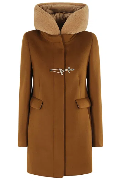 Montgomery Toggle Coat in brown with bib and fixed hood in shearling-effect fleece. Double-entry flap pockets. Concealed snap zip fastening and Fay toggle. Internal label with the name of the garment. Regular fit. Composition: 70% virgin wool, 25% polyamide, 5% cashmere. Lining: 100% polyamide. Made in Italy.