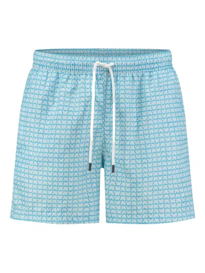 light blue all-over geometric print elasticated waistband adjustable drawstring side pocket rear patch pocket Be mindful to try on swimwear over your own garments.