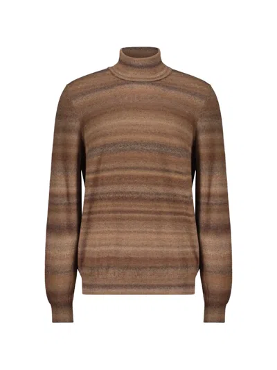 brown striped pattern high collar long sleeves cashmere ribbed hem