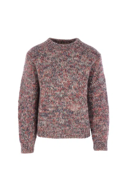 Federico Curradi x 10 Corso Como sweater handcrafted in a wool and mohair blend knit in shades of burgundy, gray, and ivory. It features a round neckline, long sleeves, and ribbed edges.