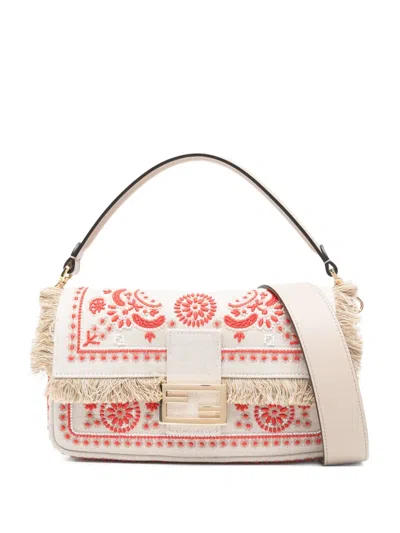 FENDI Baguette Embroidered Fringed Tote Bag In Neutral