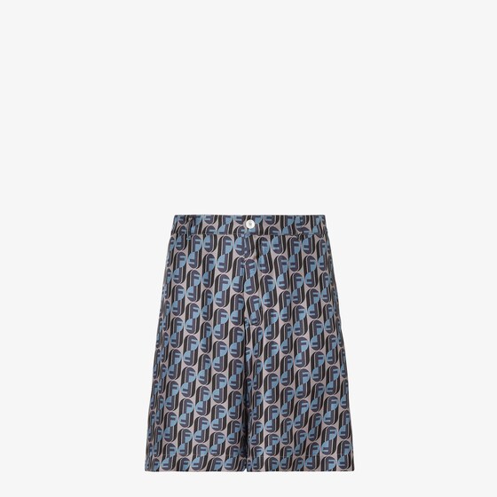 Bermuda shorts with side pockets and belt loops at the waist. Made of silk with Fendinity all-over print in blue, black and dove grey. Mother of pearl button fastening. Made in Italy. Size 56