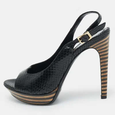 Pre-owned Black Python Embossed Leather Ankle Strap Sandals Size 38