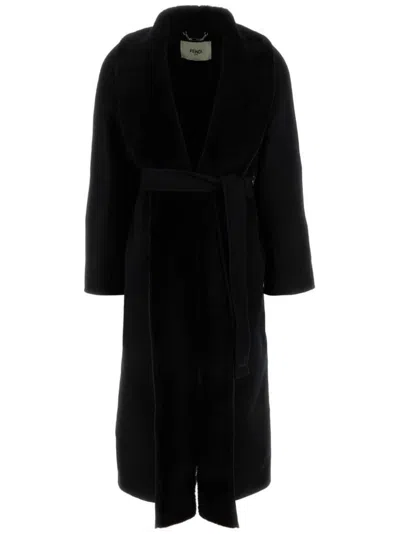 Embrace elegance with the BLACK WOOL BLEND COAT, a refined outerwear piece that seamlessly combines luxury and comfort. Crafted from a sumptuous blend of wool and silk, this coat is designed to enhance your silhouette while providing warmth for the cooler months. Its timeless black hue ensures versatility, making it a sophisticated addition to any wardrobe. Exquisite blend of 99% wool and 1% silk for a soft, luxurious feel Classic black color that complements any outfit Tailored fit that flatters the figure Perfect for layering over both casual and formal attire | Fendi Women's Wool Blend Coat in Black | Size IT 40 | FF6041ASZU Color F1FL8