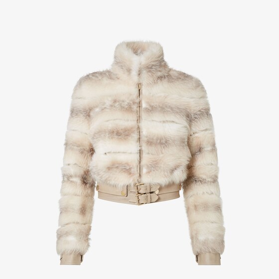 Short aviator jacket. High collar and side pockets. Zip fastening and double leather strap with buckles at the waist. Made of white ‘dorsato' shearling, inspired by the iconic Colour Pequin motif from 1967: the horizontal bands create a trompe-l'oeil effect reminiscent of the voluminous texture of fox fur. Finished with beige leather details on the cuffs. Made in Italy. Size 40