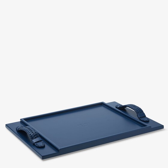 Rectangular tray inspired by a Fendi archive piece from the 1990s. Made of wood with a low-sheen blue lacquer with tone-on-tone hand-woven nappa leather handles that evoke the braiding of the iconic Peekaboo bag. The engraved Fendi Roma logo adds a distinctive touch at the centre, while the four rectangular feet connected at the corners ensure stability. The wood treatment is designed to resist wear, scratches and rubbing, and is safe for contact with food. Made in Italy. One Size
