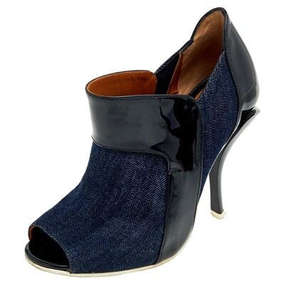 Pre-owned Blue/black Denim And Patent Leather Peep Toe Booties Size 36