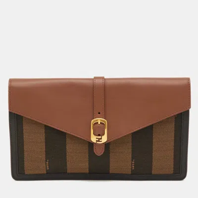 This Fendi Bustina envelope clutch combines tri color Pequin canvas with leather accents for a striking geometric surface. Ideal for dinners events and refined daytime styling it pairs well with dresses tailored separates or neutral ensembles. A compact accessory with strong graphic appeal.
