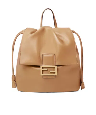 FENDI Ff Clasp Leather Backpack Medium Size In Neutral