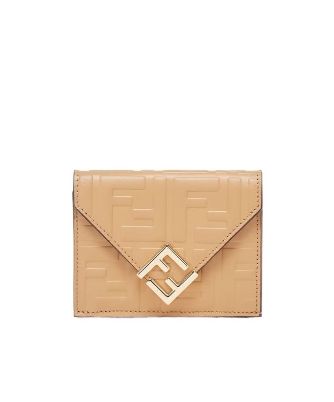 Fendi Ladies Wallets. SKU: 8M0480-ASUS-F1I73. Color: Miele Scuro/Oro Soft. Size: H: 8 cm D: 4 cm W: 10 cm. Fendi Embossed FF Tri-Fold Wallet. This wallet features a tri-fold design with six card slots, a bill compartment, and a coin pocket with a snap button. It is embellished with the tone-on-tone embossed FF motif and gold-finished metalware. Calfskin 100%. Made in Italy.
