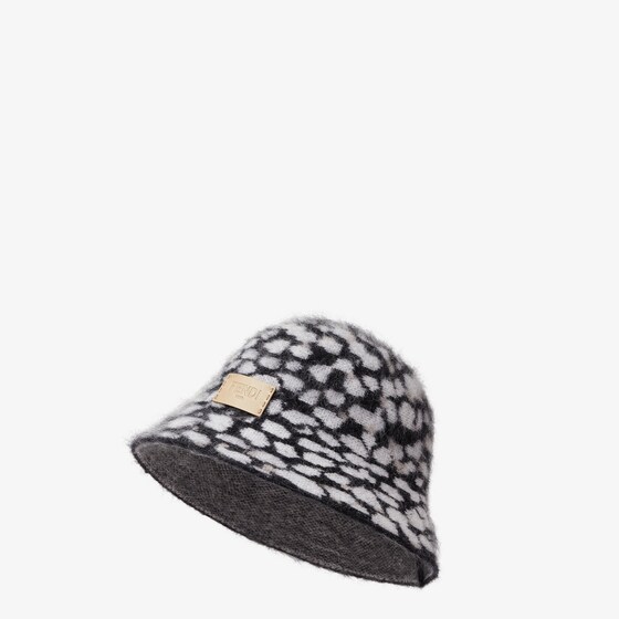 Cloche hat made in luxurious wool and mohair yarn with the collection's Falena Dots motif in black and white. Finished with a beige leather patch on the front and embossed Fendi logo. Made in Italy. Size M