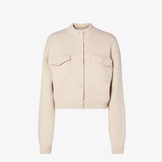 Short crew-neck jacket with long sleeves and dropped shoulders. Patch pockets with flap and button on the chest. Covered buttons. Made of white pure wool yarn. Customised with a tan-colour leather maxi patch on the back of the neck with contrasting leather FF motif. Made in Italy. Size 48