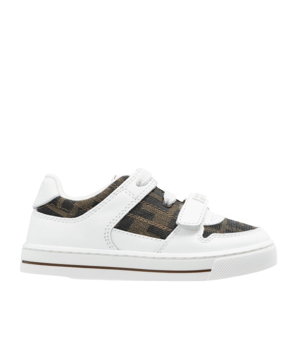 Junior sneakers with fastening and white rubber sole. Details and Velcro strap in white leather with tone-on-tone Fendi Roma logo. Made of jacquard fabric with all-over tobacco-colour FF logo. Composition: 100% Calfleather