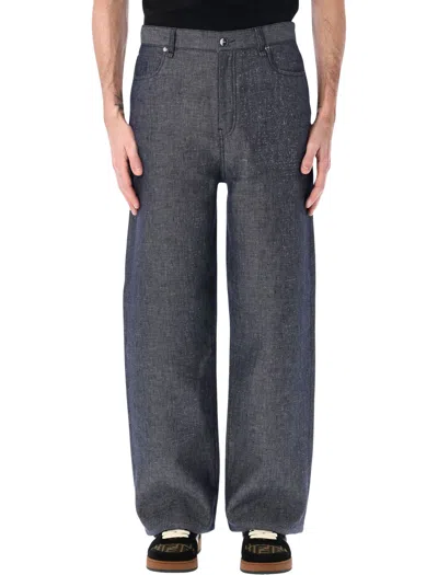 Straight-cut five-pocket jeans in dark blue denim with ff selleria embroidery and palladium-finish rivets.SpecificationValueSeasonSS26Composition55% LINEN, 44% COTTON, 1% SILKColorDARK BLUEColor CodeF0QG0Made InITALYISOITDepartmentMenSectionCLOTHINGSubsectionPANTSSize InformationJEANSSize CodeJEANS
