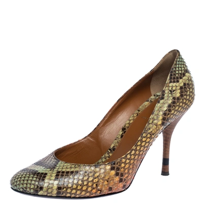 Fashion forward and chic, these fabulously designed pumps from Fendi are a statement pair. They have been crafted from python and feature almond toes. They are equipped with comfortable leather lined insoles and elevated on 9 cm heels. Theyll look great with your skirts and dresses. NOTE: AVAILABLE FOR UAE CUSTOMERS ONLY