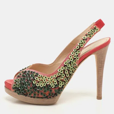 Pre-owned Pink/green Mesh Embellished Peep Toe Slingback Pumps Size 36