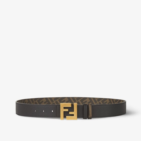 Reversible belt in brown leather on one side and in brown FF canvas on the other. It features Squared FF buckle in gold-tone metal with laser-cut effect shiny-matt mosaic and two loops. Adjustable design. Height: 3,5cm Size nationality: EU Composition: Int: 49% Polyurethane, 28% Cotton, 23% Polyester; Ext: 100% Calfskin