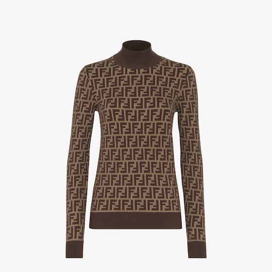 Figure-hugging jumper with a high collar and long sleeves. Made of a jacquard cotton knit with iconic brown FF motif. Trimmed with solid-coloured ribbed edges. Made in Italy. Size 38