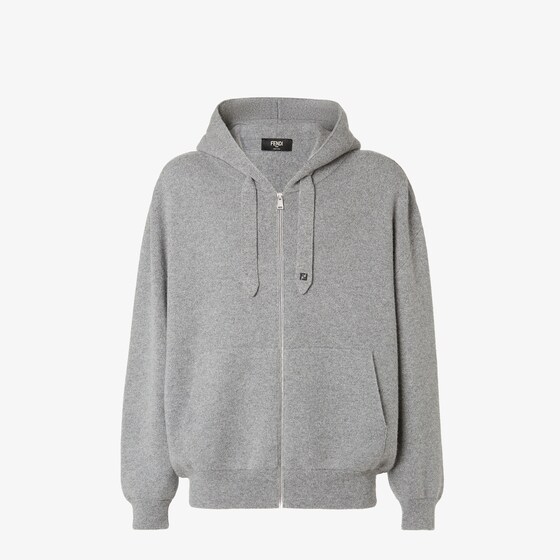 Sweatshirt with drawstring hood. Oversized fit. Low-set, long sleeves and front pouch pocket. Metal zip fastening. Made of grey cashmere yarn. Embellished with contrasting micro FF detail on the left drawstring cord. Made in Italy. Size 56