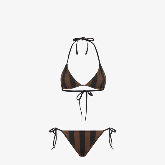 Two-piece reversible swimsuit with triangle bra and briefs. Made of Lycra® with iconic brown Pequin stripes. FF lining in the same colours. Made in Italy. Size 42