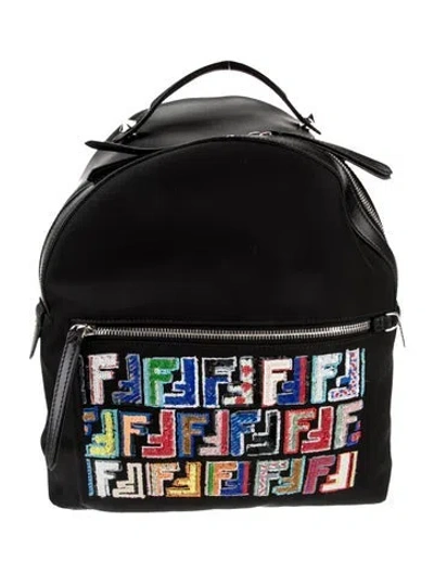 Fendi Backpack Black Nylon Zucca FF Logo Silver-Tone Hardware Leather Trim Flat Handle & Dual Adjustable Shoulder Straps Embroidered & Sequin Accents Single Exterior Pocket Logo Jacquard Lining & Single Interior Pocket Zip Closure at Top | Fendi Zucca FF Backpack in Black