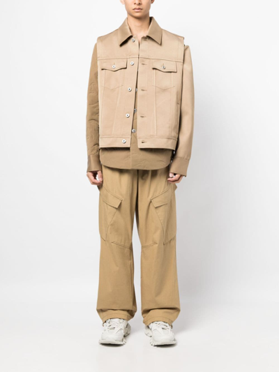 logo-patch long-sleeve jacket from Feng Chen Wang featuring khaki, classic collar, front button fastening, two chest flap pockets, logo patch to the rear, long sleeves, detachable sleeves and buttoned cuffs.