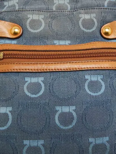 circa 2000's indigo blue Gancini pattern leather trim gold tone hardware zippered pocket Condition: GOOD. This previously owned and used item is in good condition with minimal signs of use. This may include fading of material or plating and scratches.
