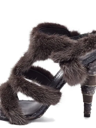 brown fur straps python leather heel high heel multiple straps