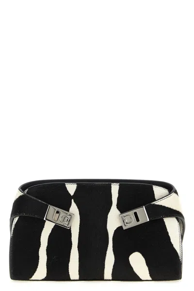 'Hug CB E/W' clutch bag in pony-effect leather with zebra print, side gussets with 'Gancini' buckle decoration, inner zip closure, adjustable and removable shoulder strap.. Composition: 100% calfskin leather (Bos Taurus) Size & Fit: W 24 x H 14 x D 7 cm