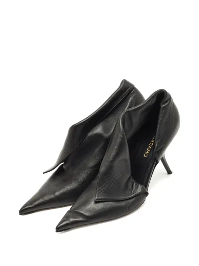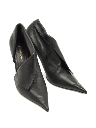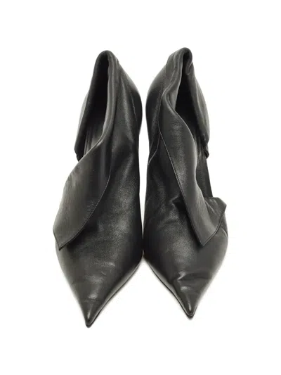 black leather pointed toe folded front slim heel pumps Condition: GOOD. This previously owned and used item is in good condition with minimal signs of use. This may include fading of material or plating and scratches.