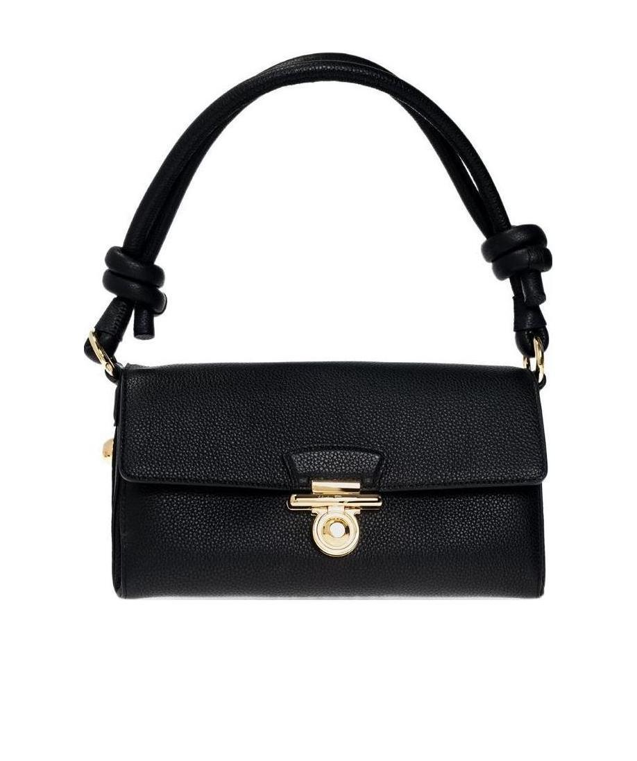 Leather handbag, decorated with Gancini pattern, bag insert on the back, adjustable shoulder straps, gold metal accessories, bag insert, inner compartment.