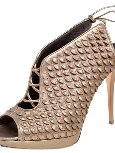 metallic gold leather python embossed leather scale pattern lace-up detail open toe design Condition: GOOD. This previously owned and used item is in good condition with minimal signs of use. This may include fading of material or plating and scratches.