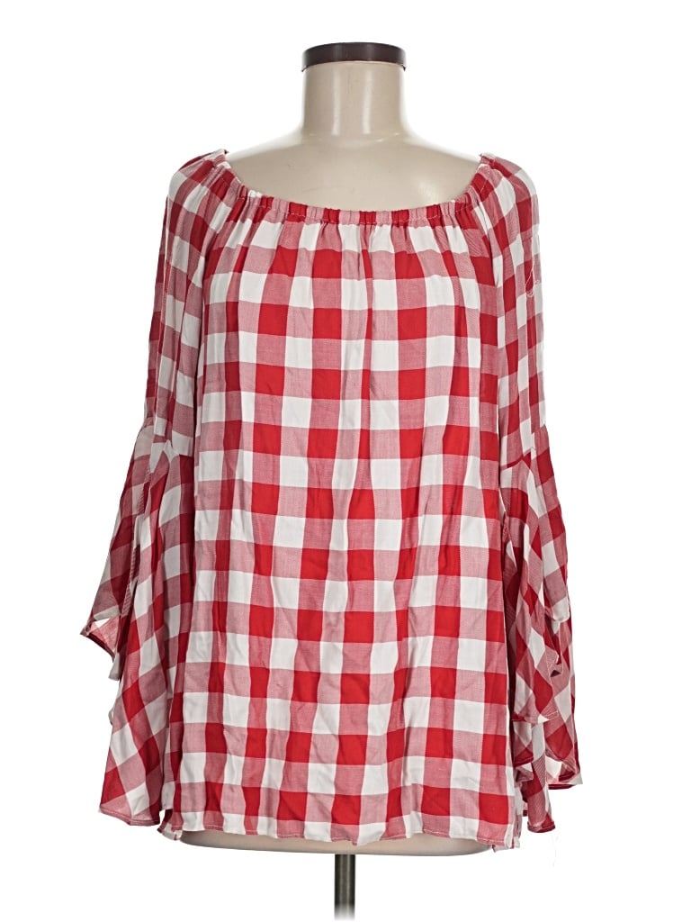 Fever 3/4 Sleeve Blouse, Size: Medium. Item Details: Red, Square Neckline, Women's Tops, 100% Rayon