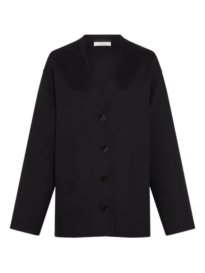 black front button fastening collarless V-neck long sleeves