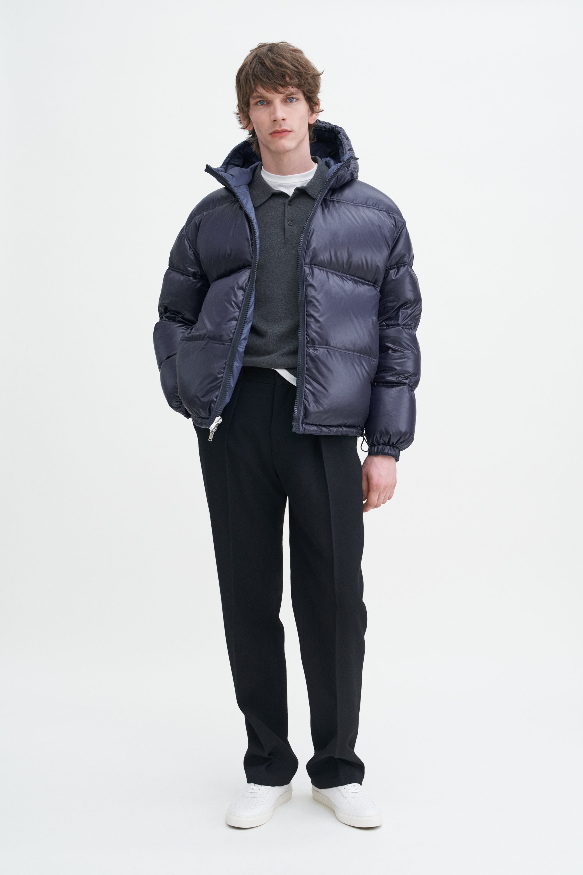 The unisex Puffer Down Jacket has a loose fit and reversible design in navy and dawn blue. The heavy Re:Down filling is recycled. Made from certfified recycled polyamide, it has a lightweight matte exterior and shiny interior which are both water resistant. Finished with side seam pockets on the outside, and hidden zipped pockets inside. Wear it with tailored trousers for a modern city look.