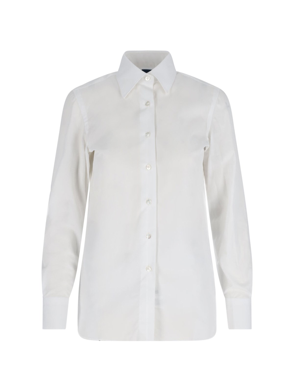 Finamore 1925 White cotton Napoli Traveller shirt with French collar, button closure, long sleeves, button cuffs, curved hem.