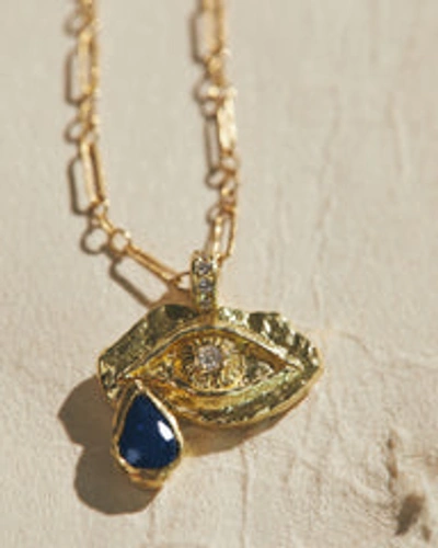 Named for Marcel Moore, a hand-carved 18k gold eye pendant pays homage to the gaze of the artist. It's accented with a white diamond pupil, a large sapphire teardrop, and hung from a loop adorned with even more diamonds. SIZE & MATERIALS Composition: 18k yellow gold pendant, teardrop sapphire, white diamonds Measurements: chain length: 16 inches + 1" extender, Eye: 9.8mm x 16mm Read about how to care for our jewelry here. Collections Gold Necklaces - Gold Jewelry - Diamond Jewelry - 18k Gold Jewelry