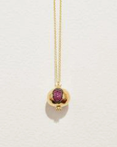 This delicate cable chain necklace features a single sculptural 18k gold hand-carved pomegranate charm with deep red ruby seeds. Web exclusive, only available at pamelalove.com SIZE & MATERIALS Composition: 18k yellow gold, ruby Measurements: chain length: 18 inches, ruby: 19mm x 15mm Read about how to care for our jewelry here. collections Gold Necklaces - Ruby Jewelry - Ruby Necklaces - Pomegranate Jewelry