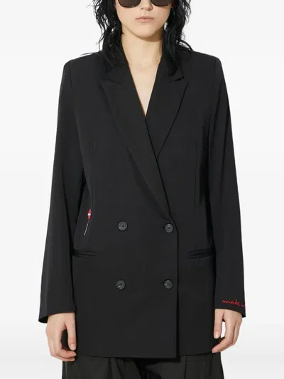 black double-breasted button fastening embroidered logo long sleeves welt pockets peak lapels straight hem