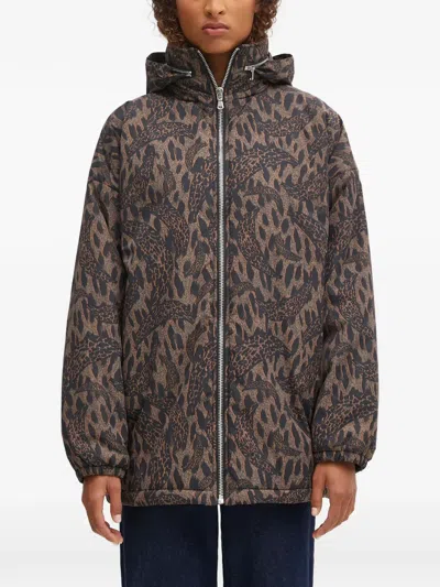 brown all-over print hood front zip fastening long sleeves elasticated cuffs