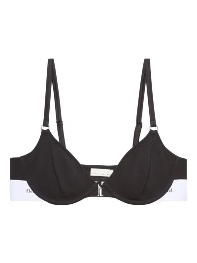 black underwire cups adjustable shoulder straps front closure elastic band logo detailing sleek design minimalistic style