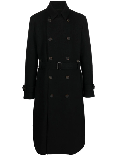 belted double-breasted trench coat from Forme D'expression featuring black, cotton, double-breasted button fastening, belted waist, classic collar, long sleeves, buttoned cuffs, straight hem, central rear vent and mid-calf length.
