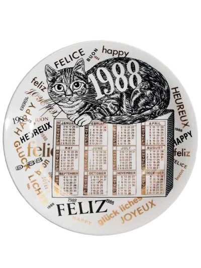 Fornasetti Calendar Plate for the Year 1988. *This product belongs to the carryover series. It is does not participate in discounts.. It serves as a conversation-starting art piece for eclectic interiors-from Vintage studies to contemporary galleries. Reveals Fornasetti passion for the feline world. Handcrafted in Italy with 24K gold-gilded edges, it upholds the legacy of collaborations with Rosenthal porcelain, blending collectible prestige with decorative brilliance.. Highlights:. Unique and intricate design. Artistic expression meets functionality. Cat & 1988 Calendar digital print. Hand wash. COMPOSITION :. ceramic 100%. Product lD : 19FW P35Z1988-R
